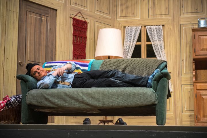 DSC_5106.JPG: Der rabiate Franz Hürlimann (Roland Schmid) stösst die Fernsehreporterin Cindy Hofmann (Nicole Müller) kurzhand aufs Sofa |