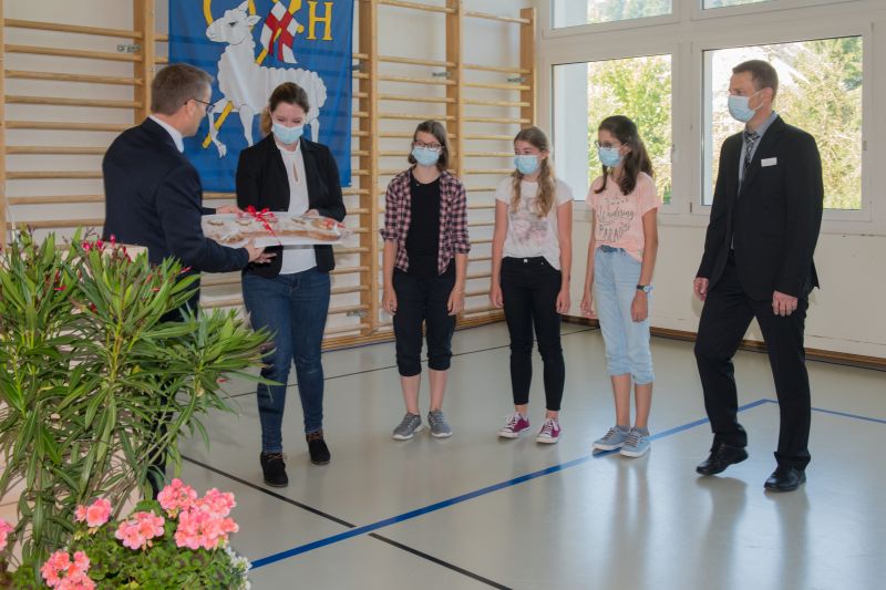 Gemeindeammann Pius Hodel überreicht der Co-Schulleiterin Alexandra Wieser symbolisch den Schlüssel, beobachtet von den Schülerinnen Selin Schärli, Amanda Marbach, Sinah Aregger und Co-Schulleiter KIaus Kleeb.