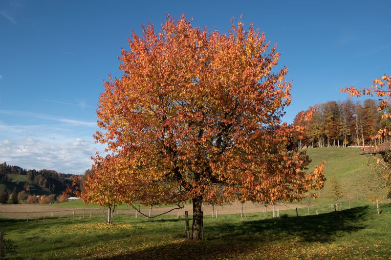 Blühende Kirschbäume sind nicht nur im Frühling eine Augenweide, sondern auch im Herbst, wenn sich die Blätter verfärbt haben. Doch warum färben Bäume ihre Blätter gelb, rot, braun und orange? Bäume teilen sich ihre Nährstoffe genau ein. Da sie im Winter zur Minimierung der Verdunstung ihre Blätter abwerfen, «recyceln» sie zuvor alle wichtigen Stoffe. Vor allem das fehlende Chlorophyll lässt die Blätter in einer anderen Farbe erscheinen. Das alles überlagernde Grün ist verschwunden und für den Winter in den dicken Ästen, im Stamm und in den Wurzeln gespeichert.