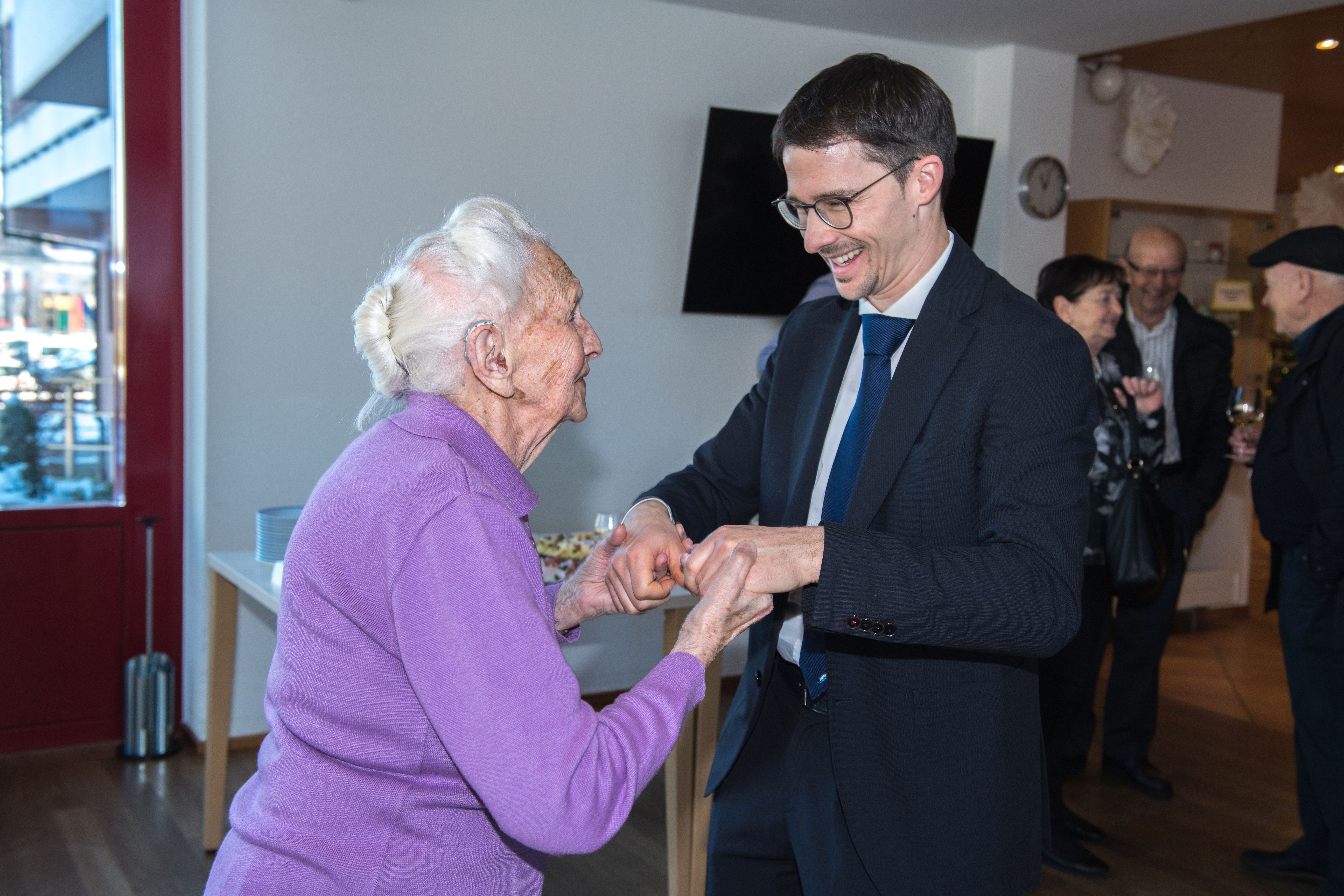 In seiner Begrüssung hob Gemeindepräsident Flurin Burkhalter hervor, wie besonders es sei, zum 100. Geburtstag gratulieren zu dürfen. Er wünschte der ältesten Bürgerin der Gemeinde Hergiswil weiterhin beste Gesundheit und viel Glück beim Jassen. Dabei scherzte er, dass er gegen sie keine Chance hätte und fragte augenzwinkernd, ob er zu ihr in den Jass-Unterricht kommen dürfe. Gemeindepräsident Burkhalter überreichte Elisa Krummenacher eine weisse Orchidee sowie die offizielle Gratulationskarte des Gemeinderats. Sozialvorsteherin Monika Kurmann schenkte ihr einen Gutschein für eine Fusspflegebehandlung, damit ihre Füsse für Tanz und Spaziergänge bestens gerüstet sind.
