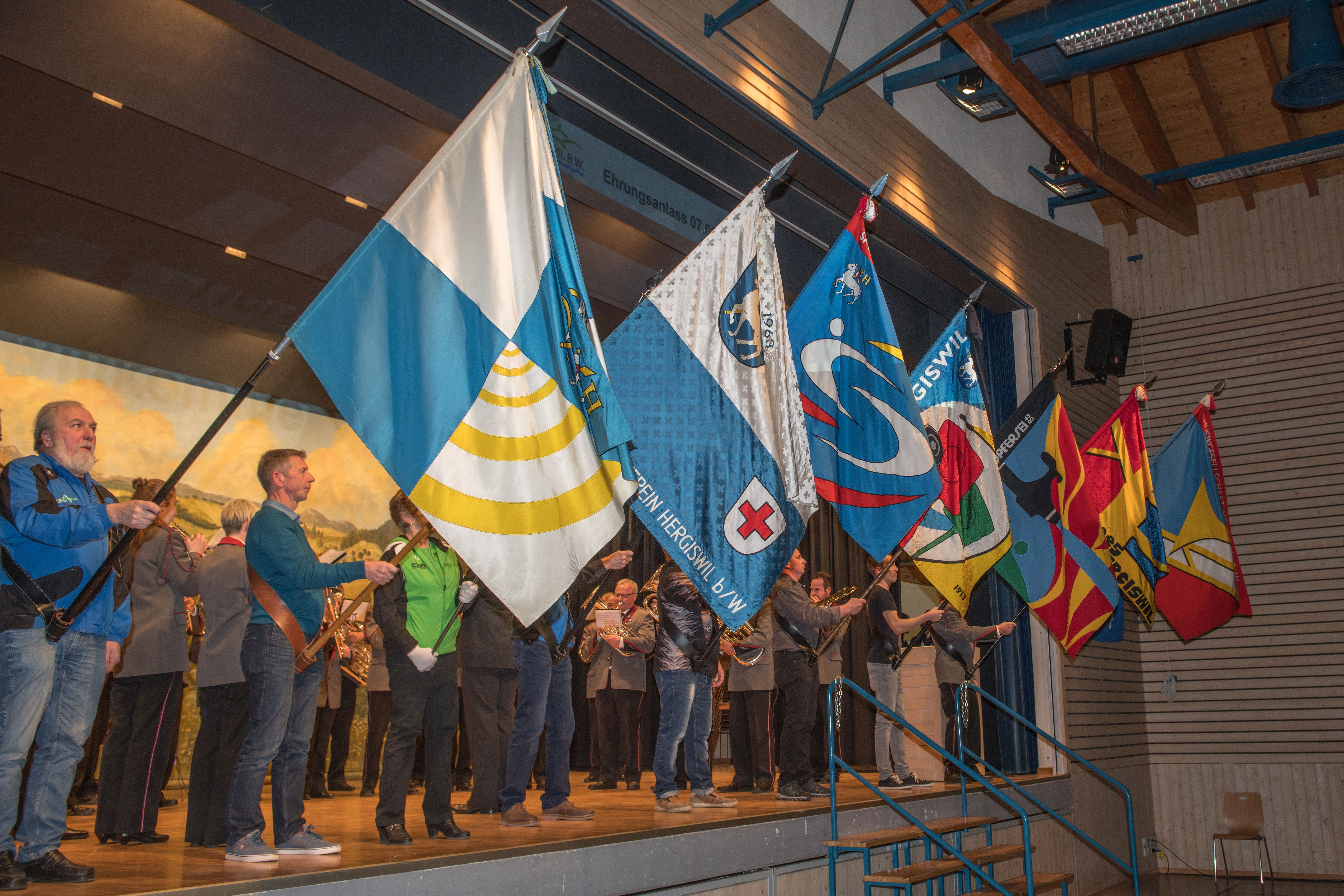 DSC_5112.JPG: Zum Spiel der Musikgesellschaft werden sieben Fahnen und eine Standarte (verdeckt) geschwenkt.