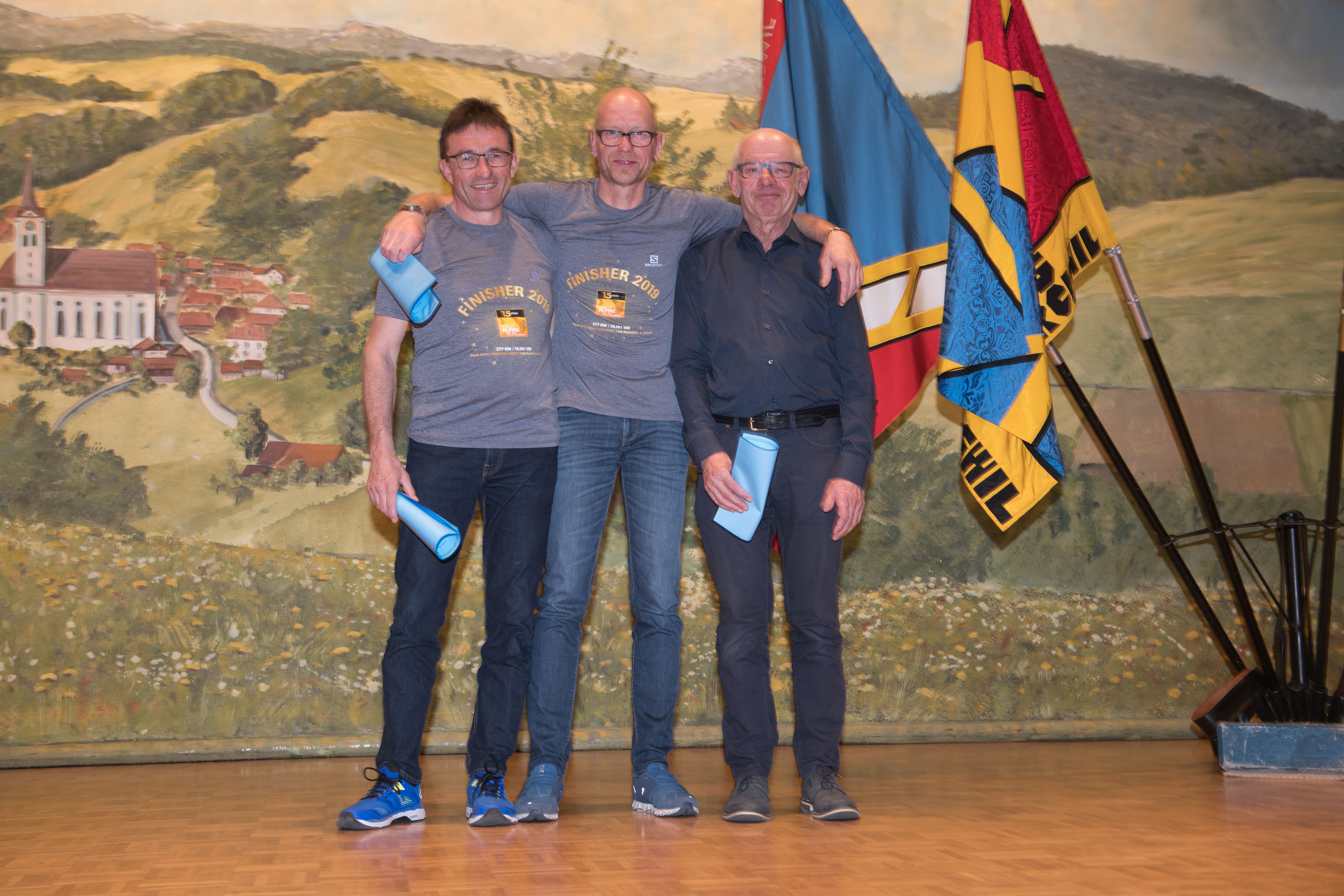 DSC_5157.JPG: Die glorreichen drei Ausdauersportler (von links) Markus Kunz, André Banz und Isidor Birrer freuen sich über die Auszeichnung.
