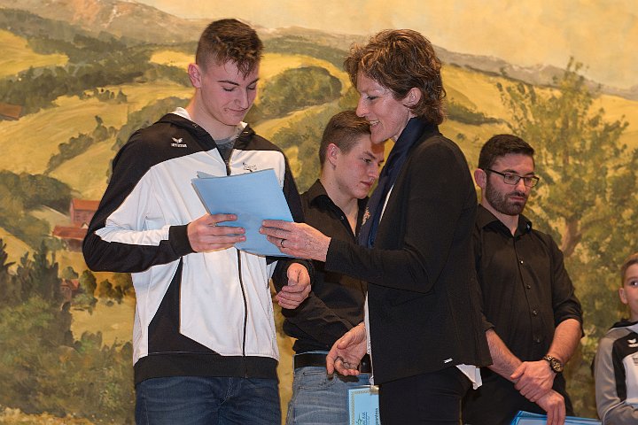 DSC_5149.JPG: Gemeinderätin Renate Ambühl überreicht Yannik Wallimann die verdiente Urkunde.