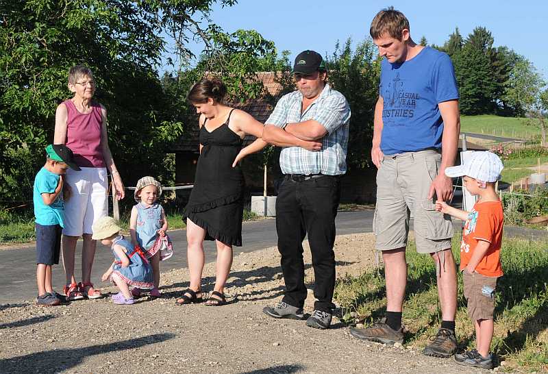 Die junge Familie Eveline und Pascal Haas mit Ihren Kindern zusammen mit Agatha Haas und Leo Zwyer beim Hof Ober-Tannen.