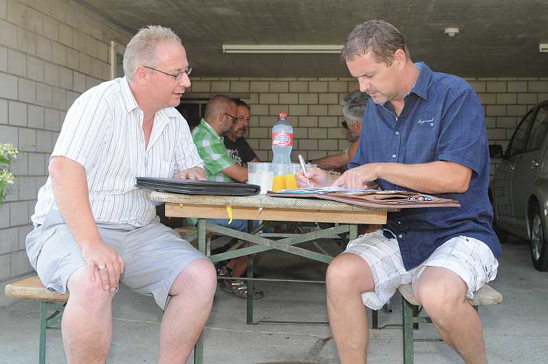 Reto Graber, lawa Kanton Luzern (links), und Guido Müller, PlanQuadrat AG Willisau, unterzeichnen die Abnahmeprotokolle.