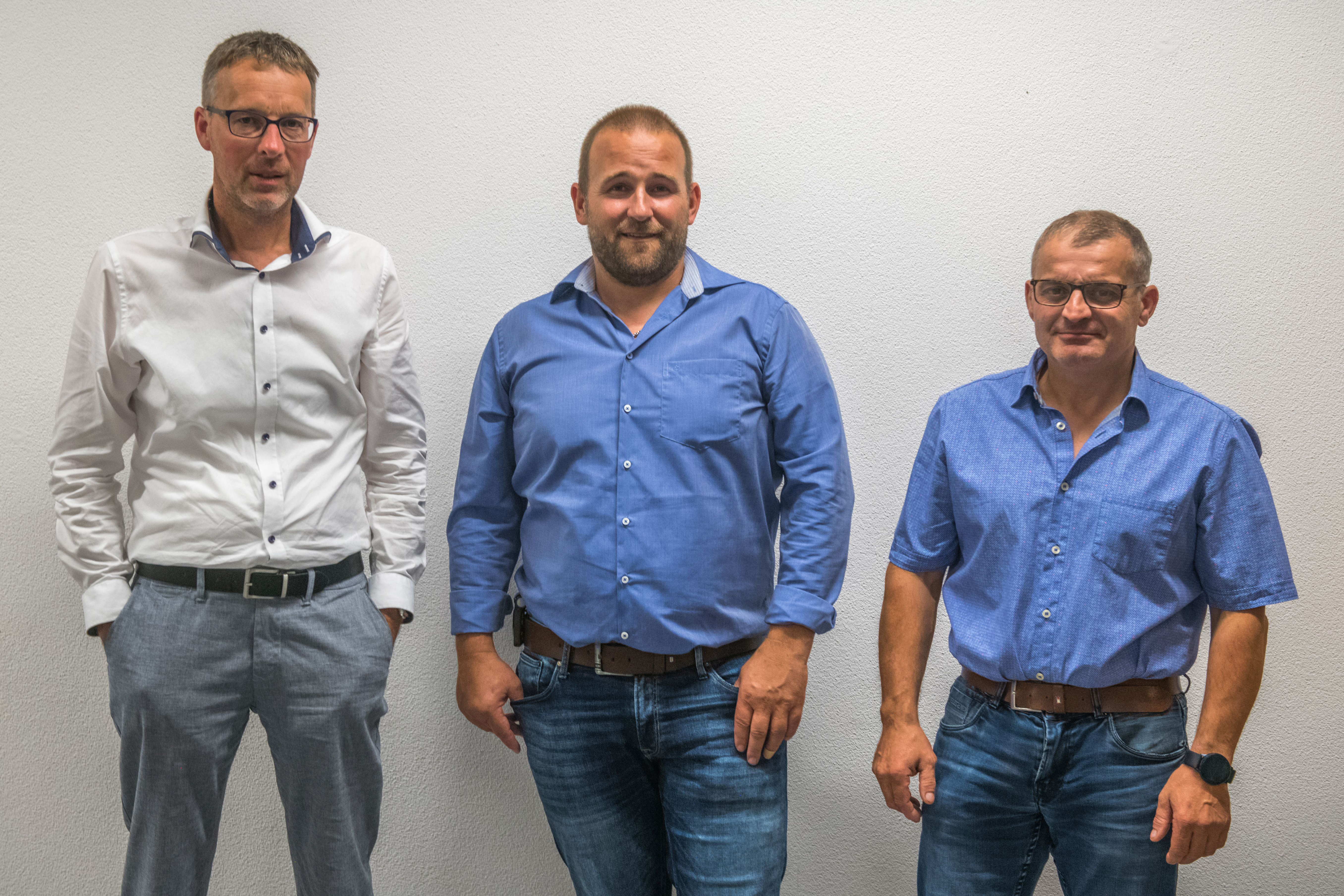 Die verabschiedeten Feuerwehrmänner Pius Roos (links) und Viktor Wermelinger flankieren Feuerwehrkommandant Hptm Stefan Buob.
