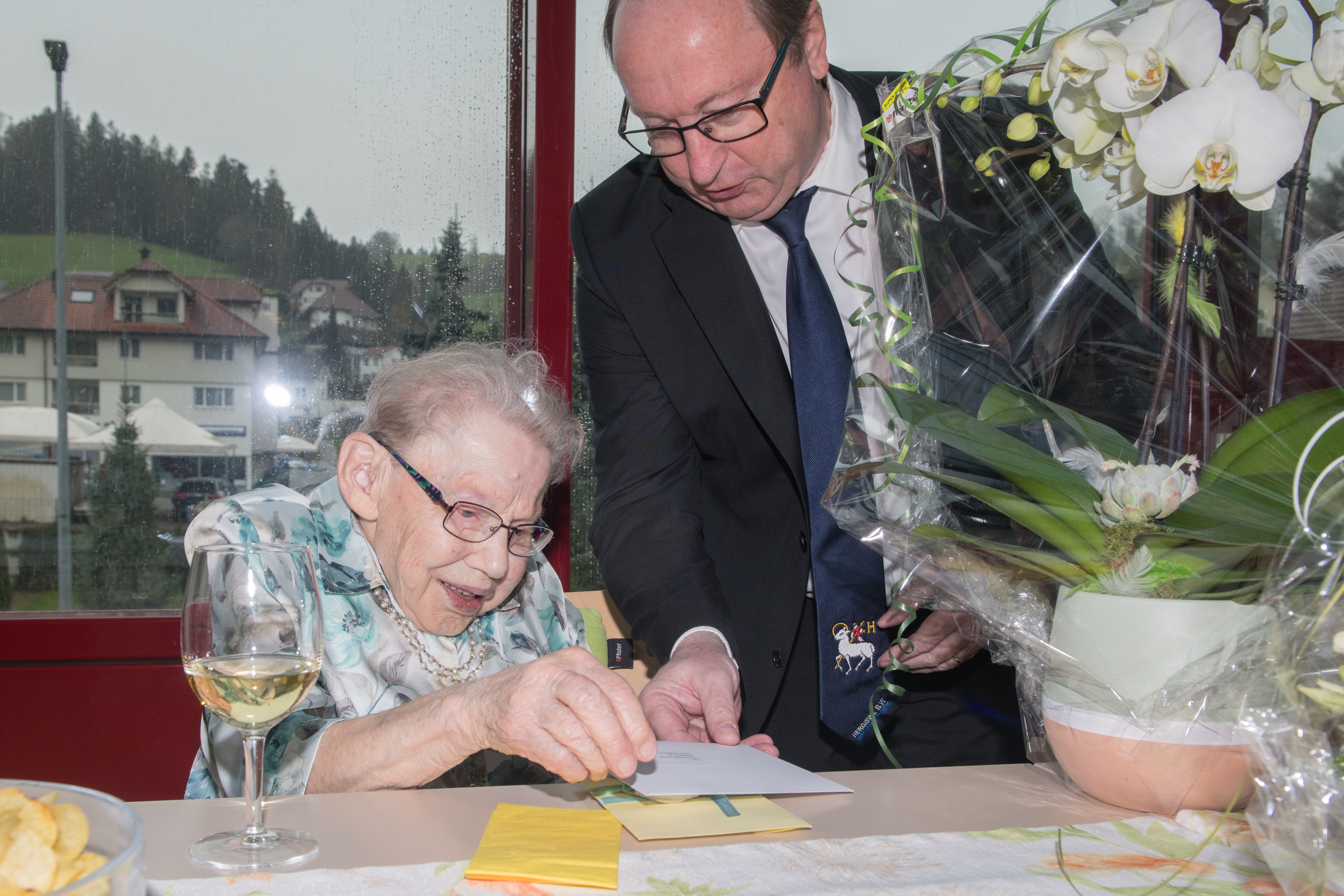 Nach der Tischrede überreichten ihr Gemeindeammann Pius Hodel und Gemeinderat Markus Kunz die Geschenke und wünschten ihr alles Gute. Bei einem feinen «Zähni-Platte» tauschten sich die Anwesenden über die Vergangenheit und die Gegenwart aus. Dabei bewies Rita Spengler ihren wachen Geist und ihren goldigen Humor.