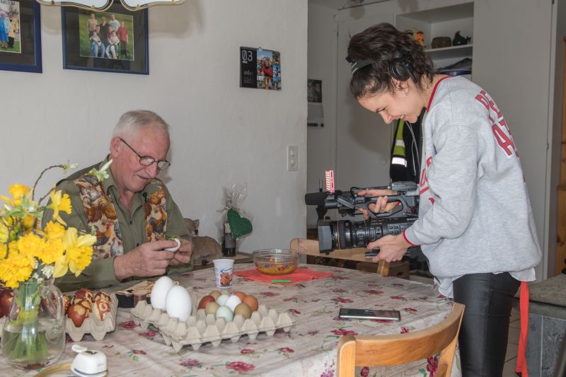 Alois Peter verziert ein Ei, während die Redaktorin Vanessa Zemp von Tele 1 die Szenerie videografiert.