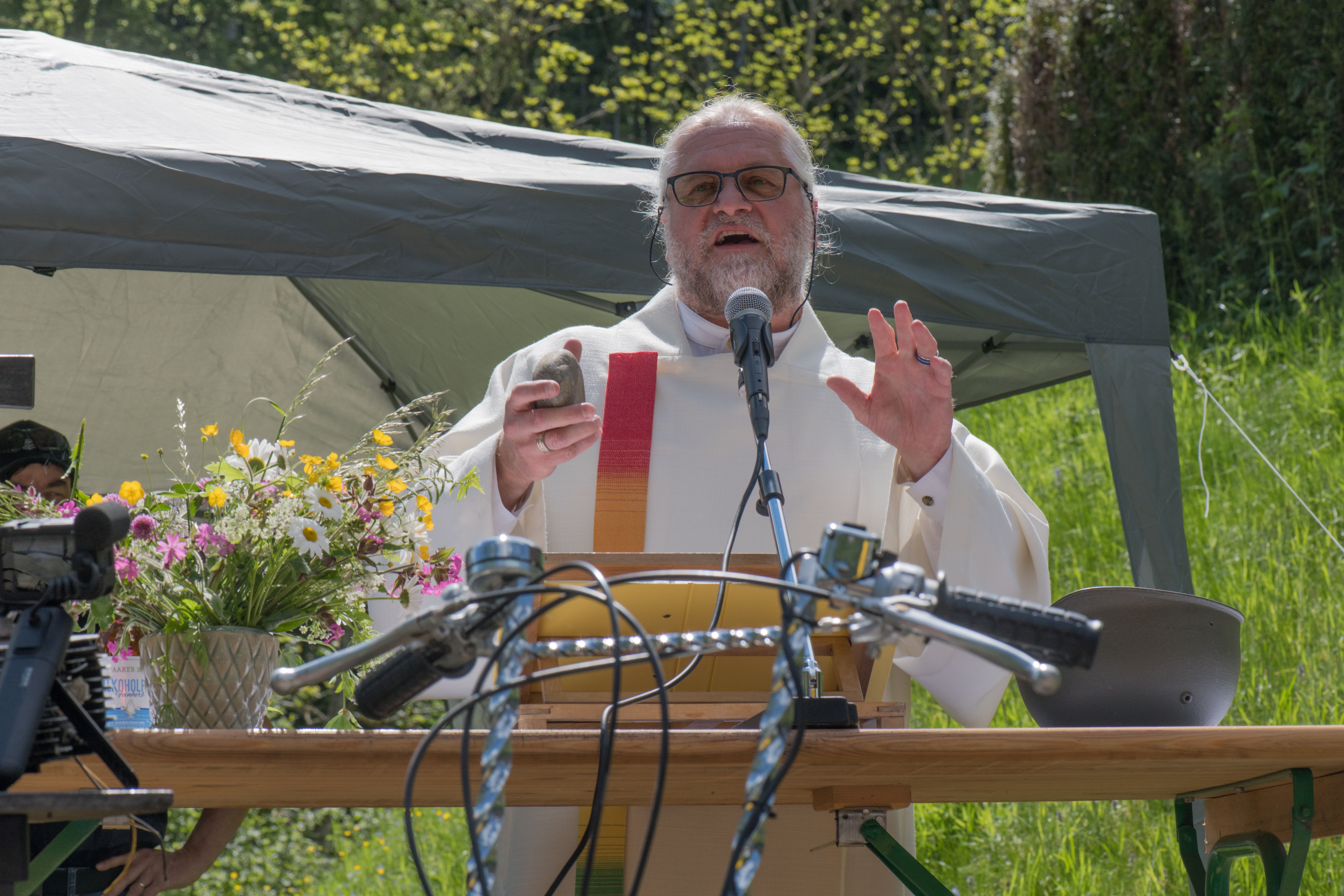 Andreas Wissmiller wählte für die Lesung ein Bibelwort unter der Überschrift «Damit eure Freude vollkommen ist» und gab drei Impulse: die Hoffnung nicht aufzugeben, in Freude und Liebe zu investieren und dem Traurigen etwas entgegenzusetzen. Er erklärte anhand eines grossen und kleinen Steins, wie man Sorgen und Probleme kleiner machen kann, indem man ihnen etwas Grösseres, wie Glauben, Freundschaften oder Hobbys, entgegensetzt. Er betonte, dass Gott Freude daran hat, wenn Menschen glücklich und geliebt sind. «Ich wünsche euch mit dem Töffli ganz viel Lebensfreude, Freundschaften, Familienzusammenhalt und eine Ahnung vom Sinn des Lebens auf eurem Fahrt- und Lebensweg», schloss Wissmiller seine Predigt.