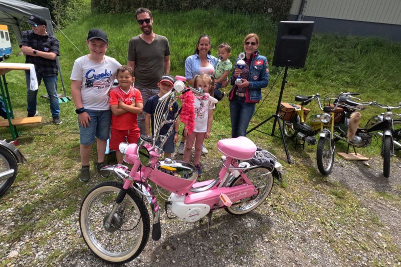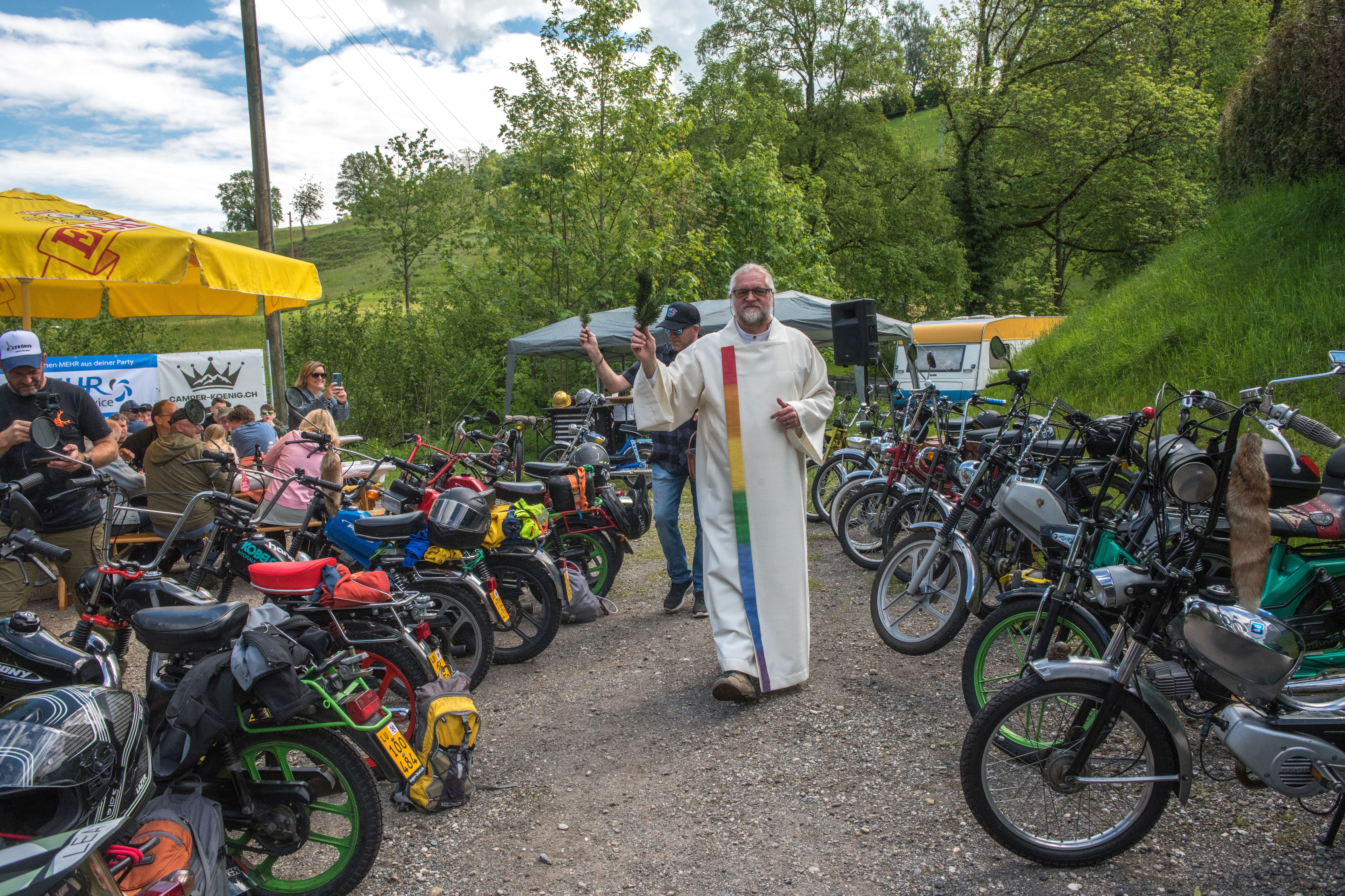Nach den Fürbitten und dem Vaterunser segnete Andreas Wissmiller die Aufkleber mit dem heiligen Christophorus, dem Schutzpatron aller Reisenden. Er und der Präsident des TC Henderland besprengten anschliessend die Töffli und Menschen mit Weihwasser. Bernhard Jenni lud in die Festwirtschaft ein, wo auch die Pflege der Kameradschaft nicht fehlen durfte. Am frühen Nachmittag wurden drei Pokale vergeben. Sascha Studer aus Escholzmatt erhielt den Pokal für die weiteste Anreise (42 Kilometer), die grösste Gruppe stellten die Bomber Drives aus Luthern (35 Personen) und der Pokal für das originellste Töffli ging an Sandra Hochueli, Töffliteam Wolhusen. Übrigens: Der Begriff «Spetz 33» im Vereinsnamen des TC Henderland hat zwei Bedeutungen. Einerseits bedeutet er die knappe Höchstgeschwindigkeit der Töffli und andererseits findet sich die Zahl 33 in der Postleitzahl von Hergiswil LU. Die nächste Töfflisegnung findet am Samstag, 7. Juni 2025, wiederum beim Skilift-Beizli im Hübeli statt.