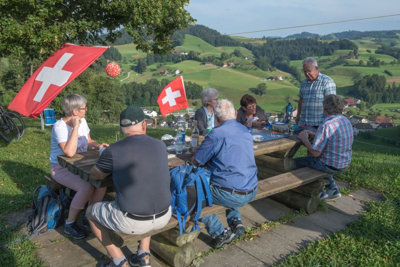 Alois Theiler, ein Mitglied von Hergiswil Tourismus, verwandelte den Grillplatz Hickern mit zwei grossen Schweizerfahnen und einer Wimpelkette mit Schweizerfähnchen quasi in das «Rütli von Hergiswil». Statt auf den Urnersee zu schauen, schweiften die Blicke der fünf Frauen und acht Männer sichtlich stolz über das schmucke Dorf und die malerische Napflandschaft. Kurz vor 18 Uhr entzündete Theiler das Holz auf der Feuerstelle, damit das selber mitgebrachte Grillgut gebrätelt werden konnte. Bei einem guten Tropfen Wein, einem kühlen Bier oder einer anderen Tranksame sowie diversen Beilagen genoss die Festgemeinde das fröhliche Beisammensein.