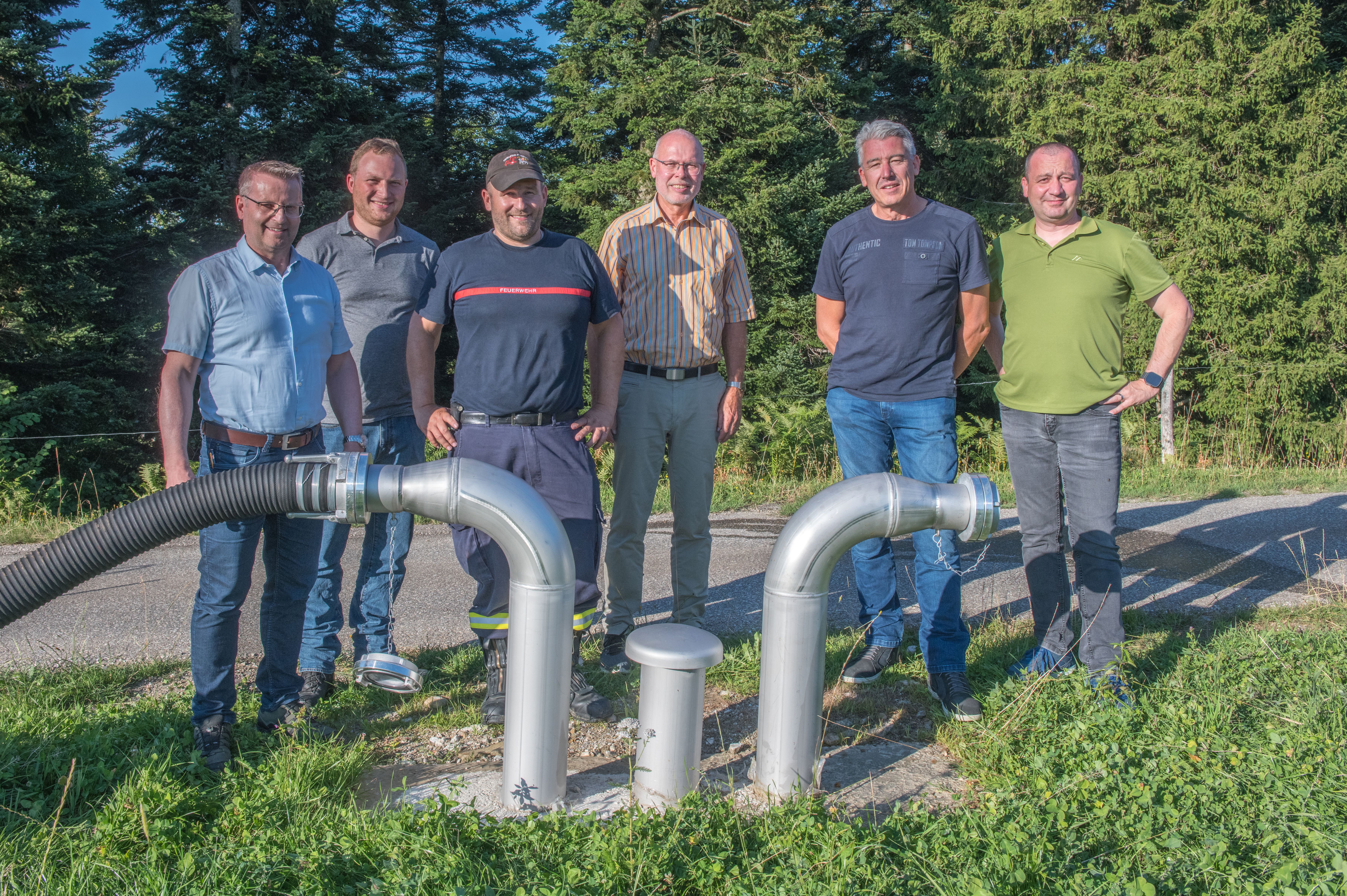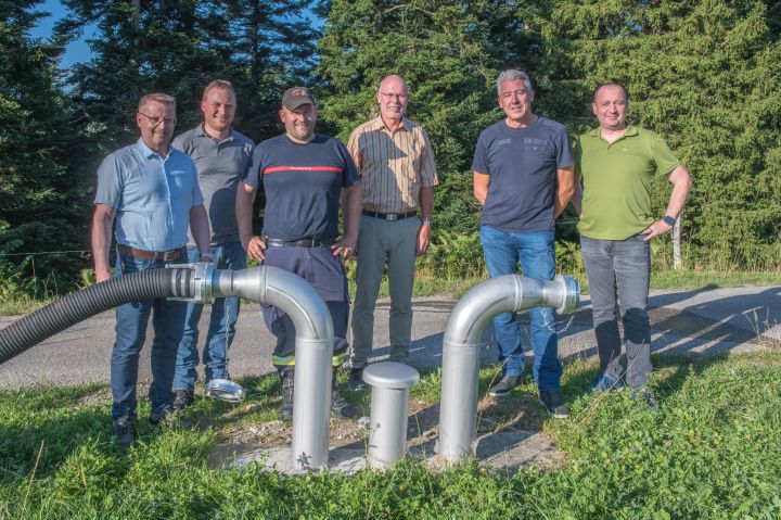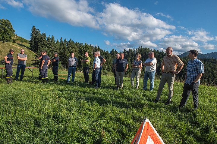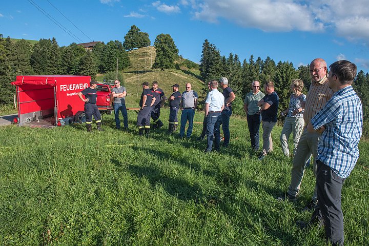 DSC_3406.JPG: Pius Hodel, Gemeindeammann; Ueli Schöpfer, Gebäudeversicherung Luzern (GLV); Stefan Buob, Kommandant Feuerwehr Hergiswil; Adrian Duss, Gemeindepräsident Menznau; Ueli Wanner (GLV); und René Nietlispach, Kommandant Feuerwehr Menznau (von links).