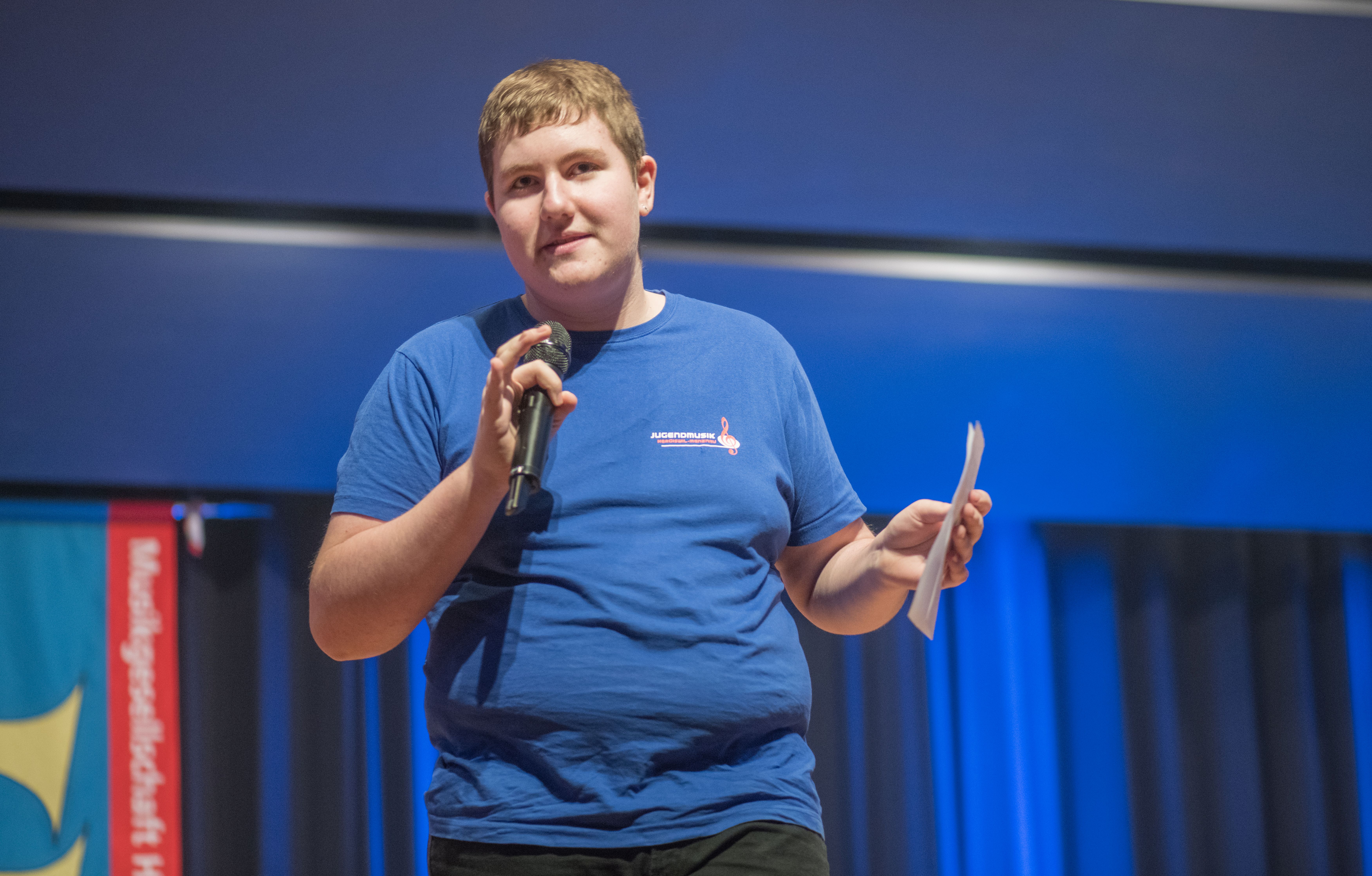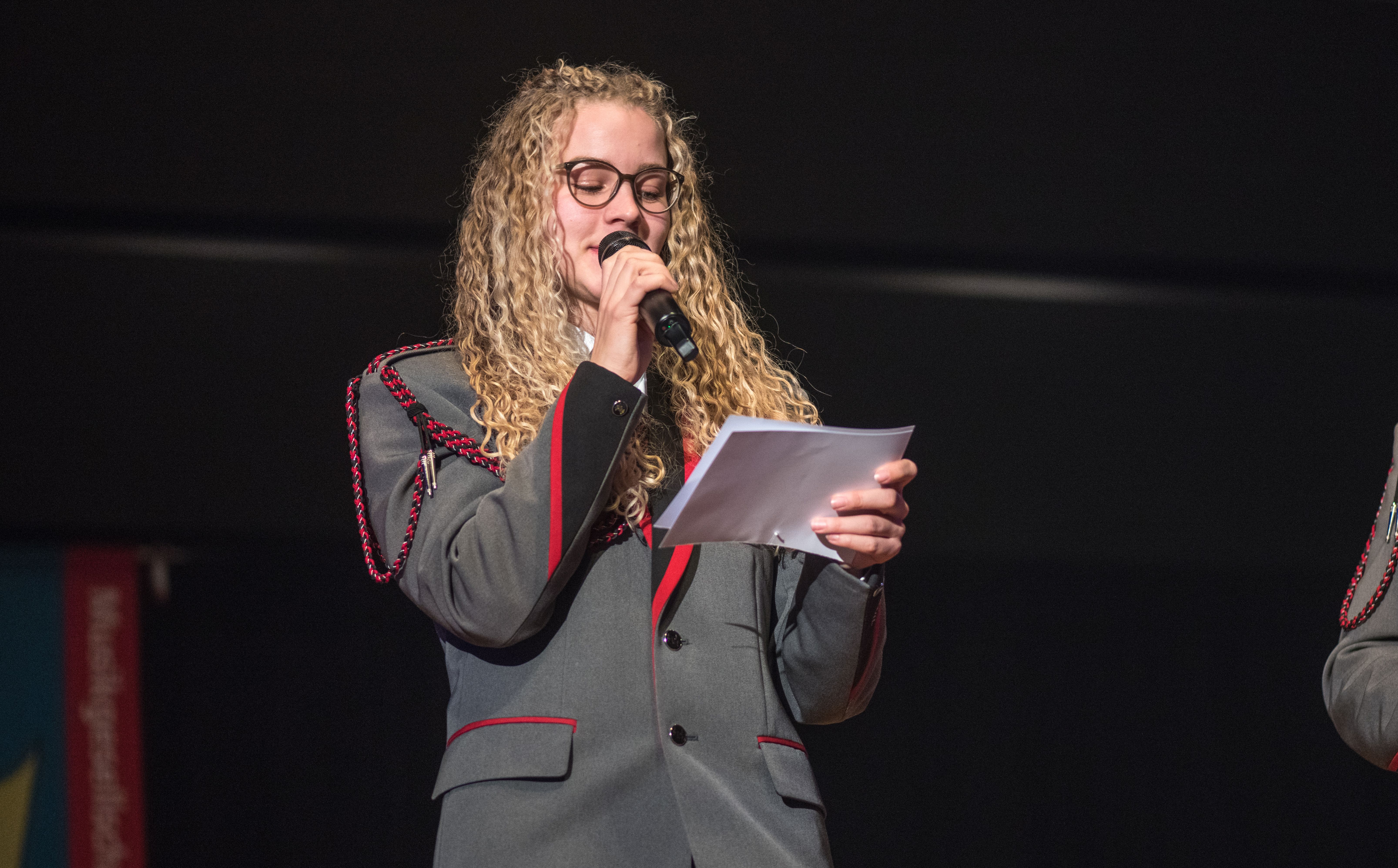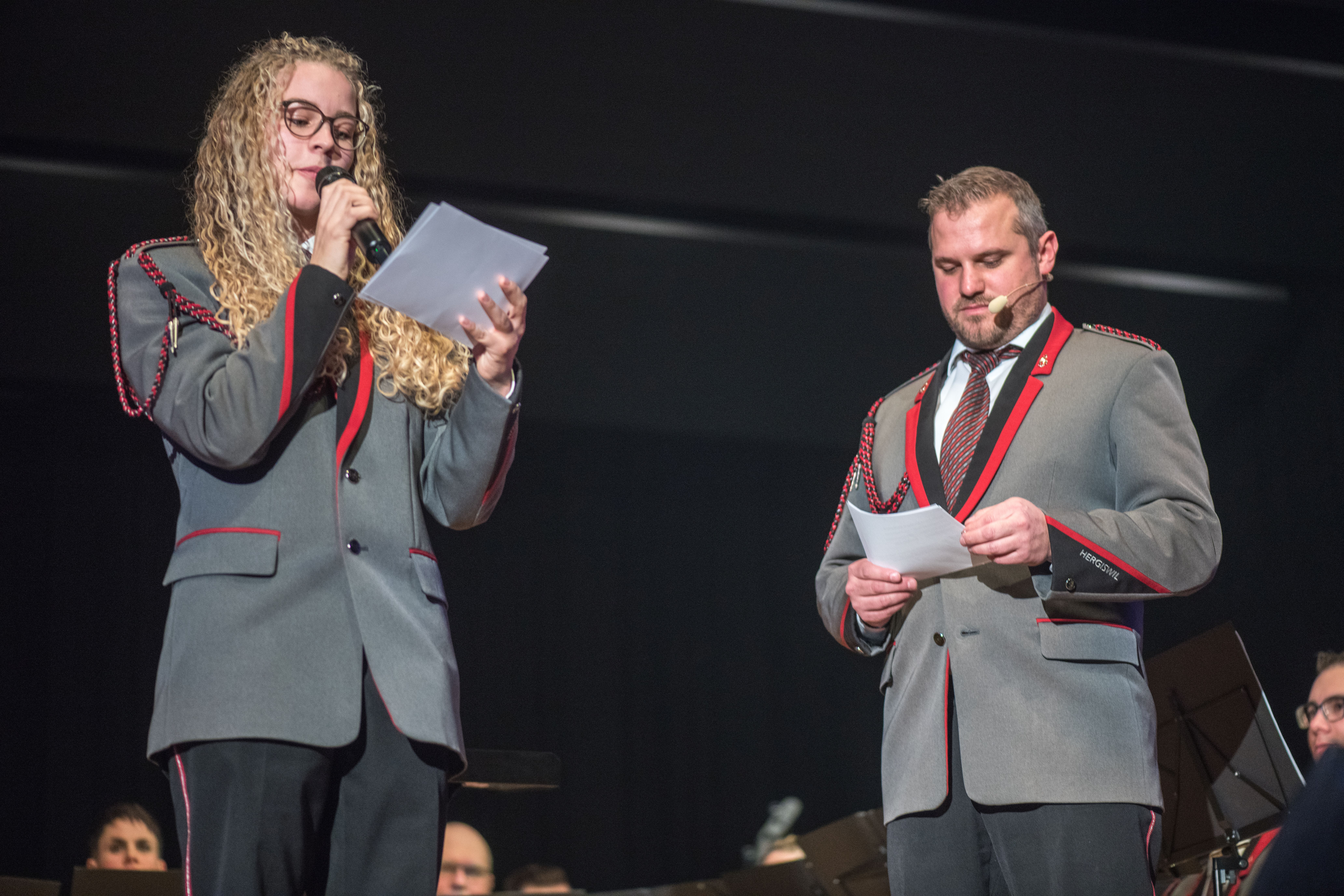 DSC_1456.JPG: Die neue Vizepräsidentin der Musikgesellschaft Hergiswil, Julia Kunz, verliest die unzähligen Delegationen