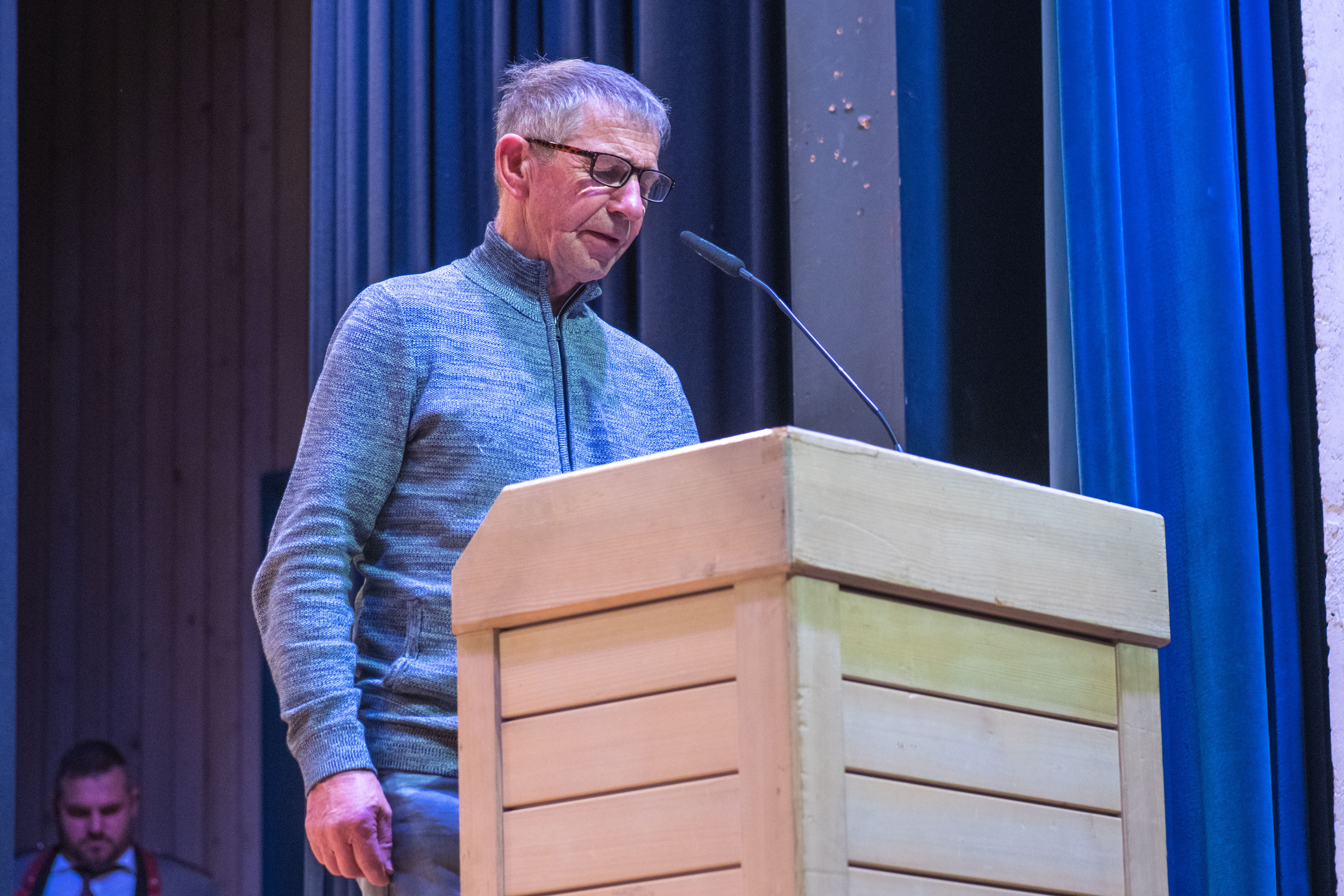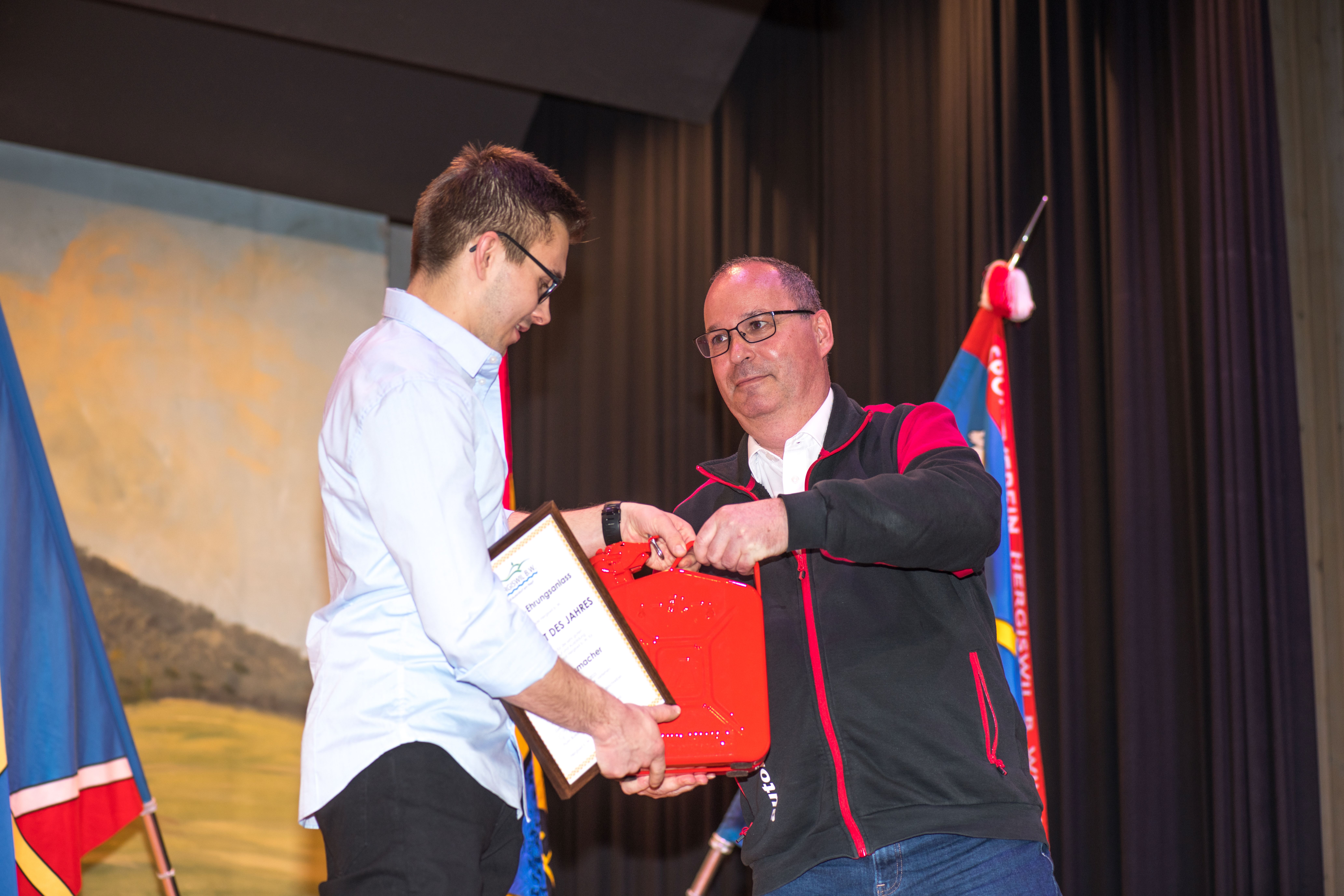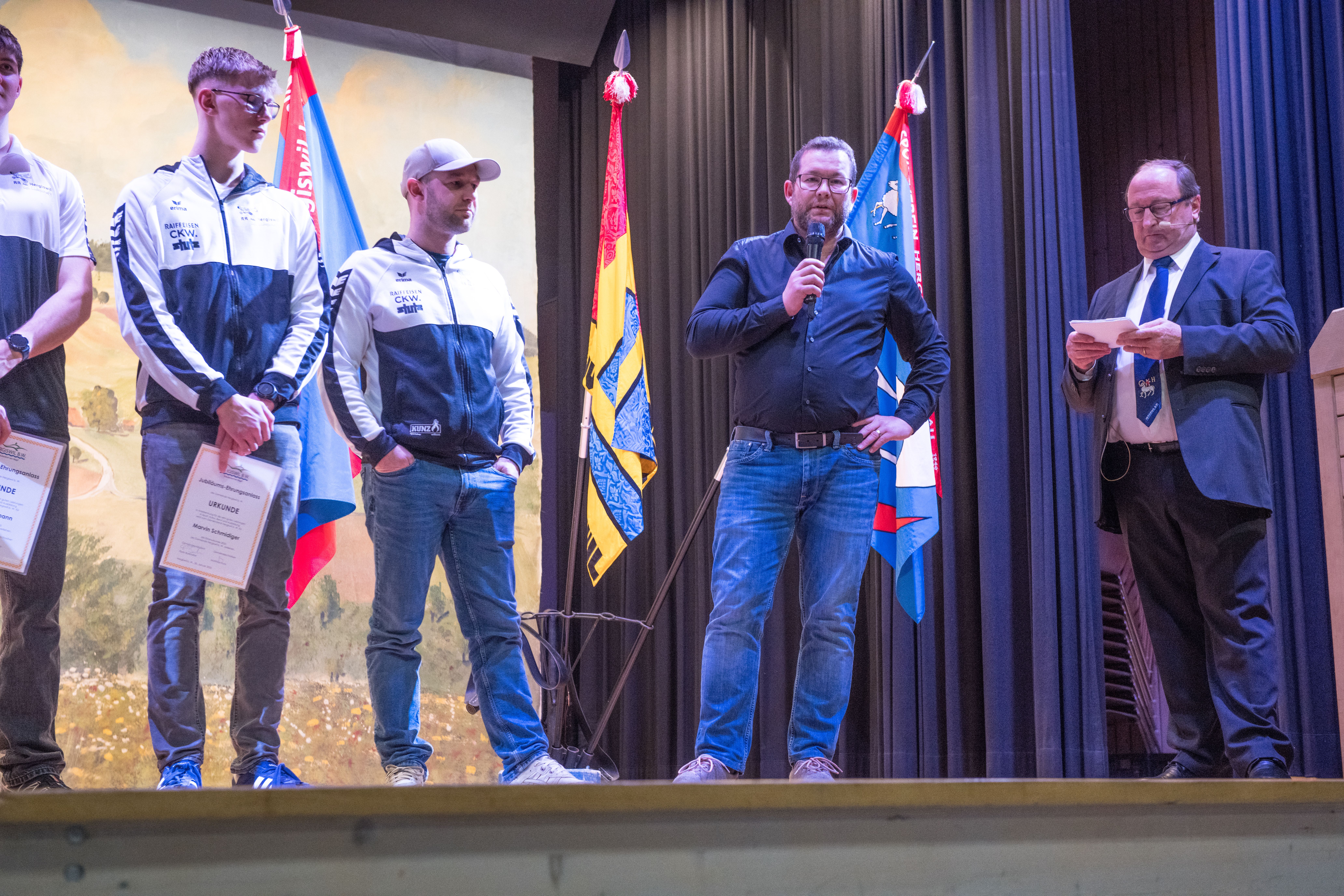 Der Präsident der Ringerriege Hergiswil, Daniel Stadelmann, steht dem Moderator Markus Kunz Red und Antwort.
