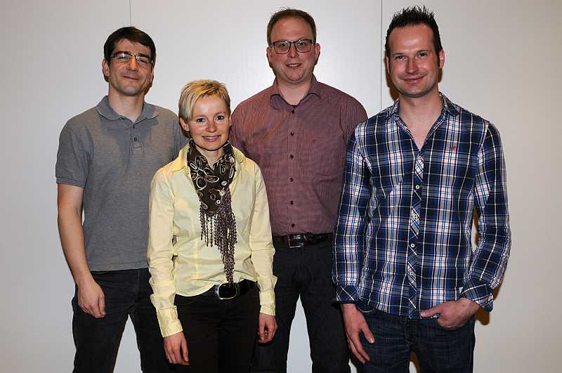 Von links: Ehrenmitglied Philipp Theiler, Musikkommissionspräsidentin Elvira Wiprächtiger, Direktor Remo Freiburghaus und Präsident Stephan Bucher.
