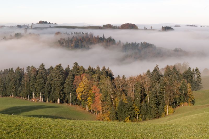 Blick von der Unterskapfstrasse über den Gschneitwald Richtung Nordwesten bis zum Jura.