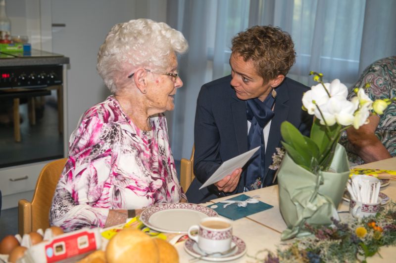 Mit einigen Reminiszenzen aus dem Leben der Jubilarin, die der Gemeindepräsident mit viel Witz und Humor würzte, brachte er die Anwesenden zum herzhaften Lachen. Die Sozialvorsteherin Monika Kurmann überreichte der Jubilarin eine wunderschöne Orchidee, einen Gutschein und die obligate Glückwunschkarte der Gemeinde. Die Jubilarin revanchierte sich, indem ihre Töchter Käthy, Ruth und Ursula den Gästen mit einer feinen Znüniplatte, Buttergipfeli, Mutschli und Kaffee bewirten liess. Und mit einem Glas Moscato wurde auf den hohen Geburtstag angestossen.