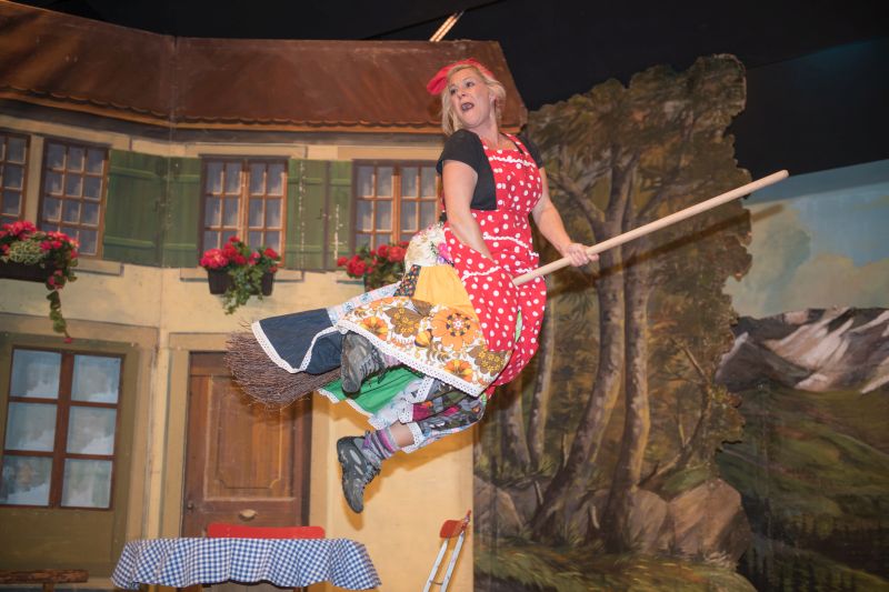 «D Bääsehäx» Trix (Pamela Stadelmann) übt das Fliegen mit einem Besen, um zu einem Mann zu kommen.