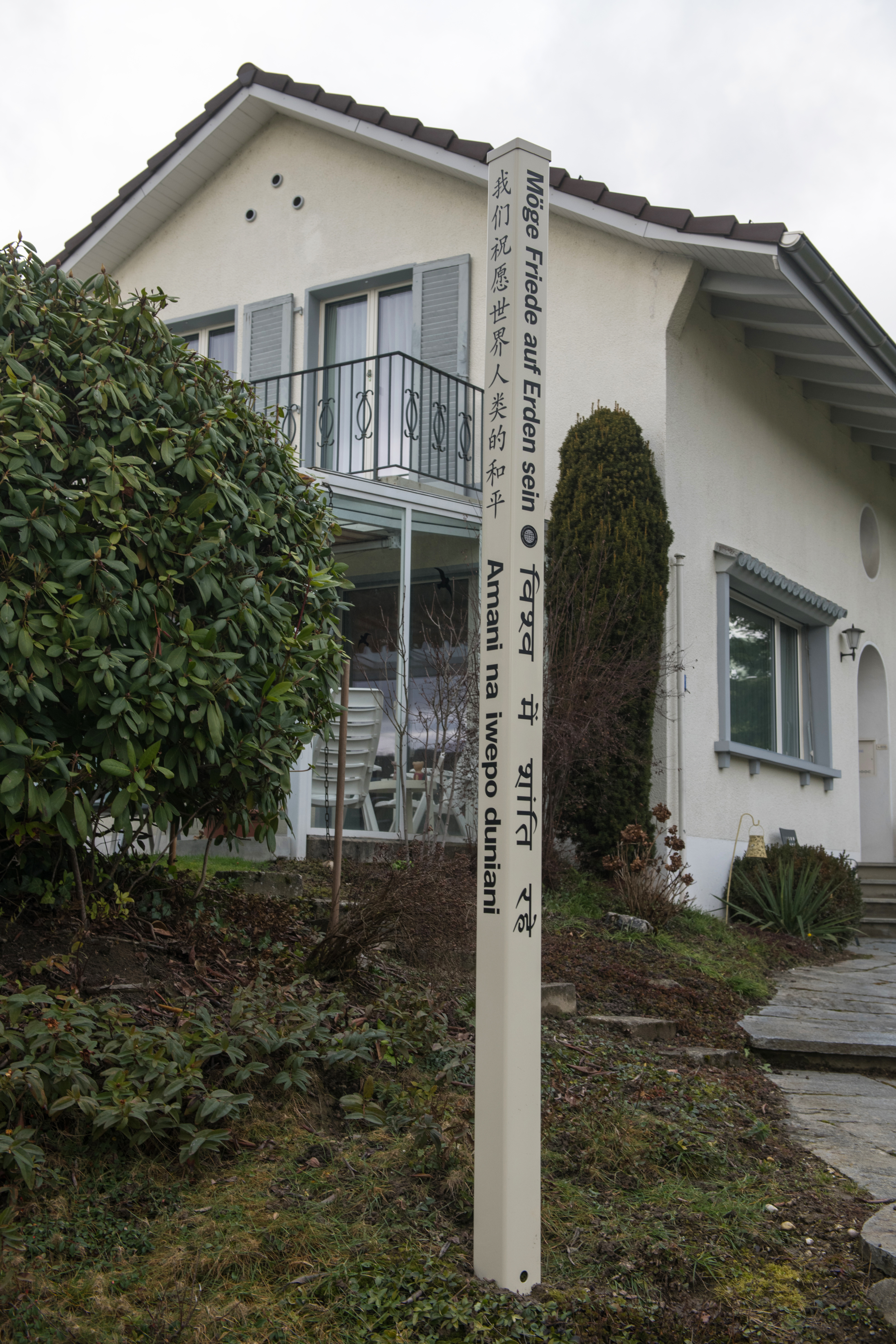 Der Friedenspfahl in Hergiswil ist oben in den Sprachen Englisch, Chinesisch, Russisch, Deutsch und unten Arabisch, Spanisch, Hindi, Swahili beschriftet