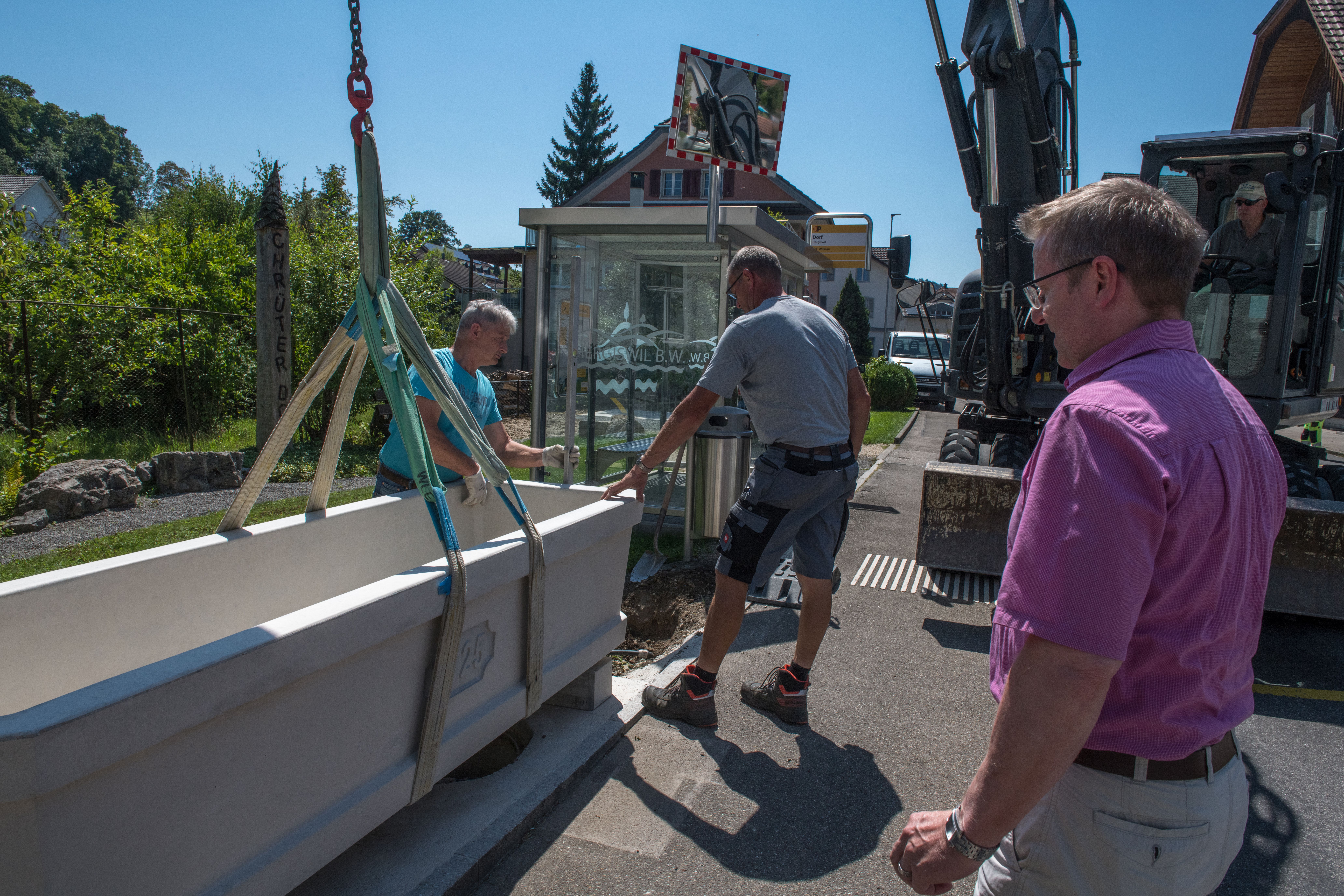 Zum Projektteam «Dorfbrunnen» gehörten Pius Hodel, Gemeindeammann; Isidor Wirz, Gemeindearbeiter; Hansjörg Zettel, Bauunternehmung Zettel AG sowie Louis Frank, Brunnenbauer. Das Setzen eines Brunnens erfordert weit mehr Fingerspitzengefühl, als man vermuten könnte. Gegen 13.30 Uhr hob Hansjörg Zettel den Brunnentrog mit einem Mobilbagger vom Lieferanhänger und platzierte ihn vorsichtig auf die vorbereiteten Sockel. Anschliessend richteten Louis Frank und Isidor Wirz den Trog millimetergenau aus. Auch der Brunnenstock wurde per Baumaschine an seinen Platz gesetzt und präzise austariert. Es folgten Feinarbeiten, bis alles perfekt ausgerichtet war. Aus mehreren Ausläufen wählte man schliesslich den Passenden aus und montierte ihn schliesslich.