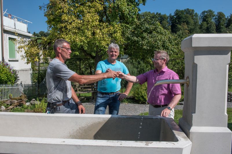 Der Brunnen im Dorfzentrum wurde nach 125 Jahren Betrieb durch ein neues, handgefertigtes Modell ersetzt. Nach der Inbetriebnahme wurde darauf angestossen – mit vom Brunnenwasser gekühltem Weisswein.